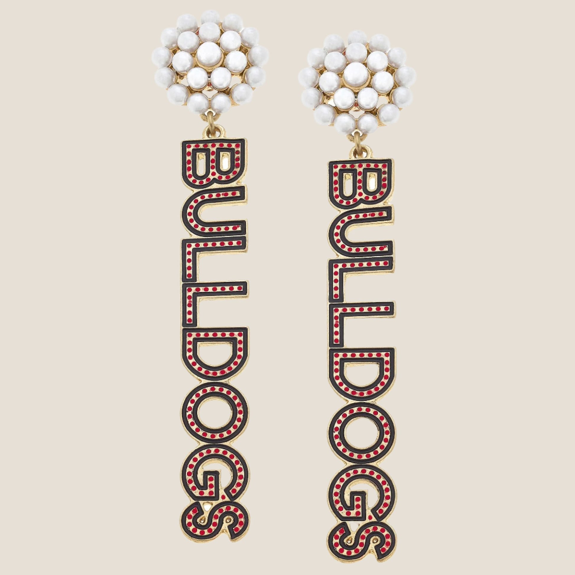 Accessorize your game day/school look with these drop earrings. The “Bulldogs” earrings are perfect for making a statement while showing off your team spirit with pearl embellishments and block letters! DETAILS: * 3" Length