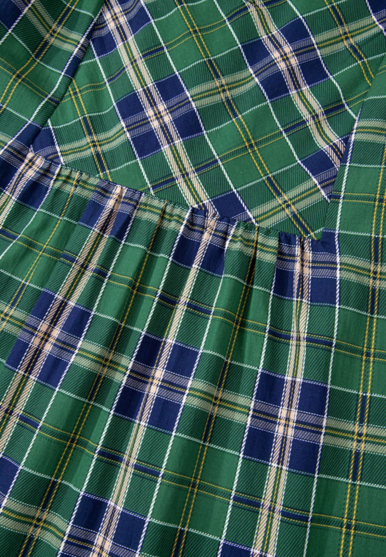 Green tartan plaid dress with long sleeves and frilly collar accent.. 55% cotton, 45% viscose
